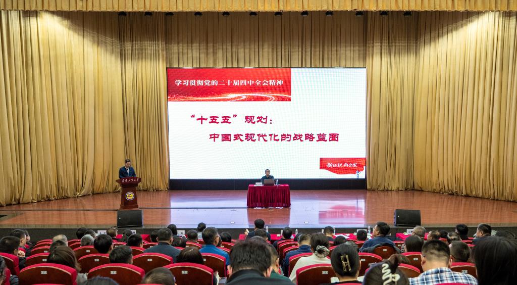 为深入学习贯彻党的二十届四中全会精神,切实把思想和行动统一到党中央决策部署上来,11月14日,学校在图书馆报告厅召开学习贯彻党的二十届四中全会精神培训会暨党委理论学习中心组(扩大)学习会。会议邀请省委党校经济学教研部主任王行伟教授作党的二十届四中全会精神专题辅导报告。校领导班子成员、全体中层干部、科级干部、基层教学组织负责人、党支部书记、辅导员和全体统战成员参加会议。校党委副书记刘艳军主持会议。