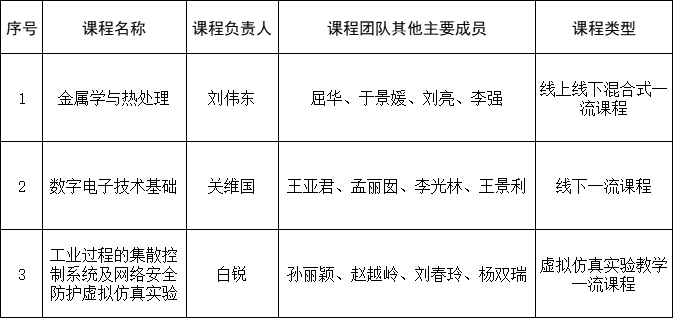 近日,教育部发布《关于公布第三批国家级一流本科课程认定结果的通知》,我校3门课程获批第三批国家级一流本科课程,分别是线上线下混合式一流课程《金属学与热处理》、线下一流课程《数字电子技术基础》、虚拟仿真实验教学一流课程《工业过程的集散控制系统及网络安全防护虚拟仿真实验》。截至目前,我校共获批6门国家级一流本科课程。