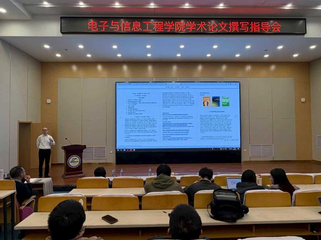 Mikhail Y. Kovalyov院士以“How to Write a Scientific Paper”为题,为电子与信息工程学院师生作专题学术报告。他介绍了白俄罗斯国家科学院信息学问题联合研究所的发展历程、研究方向及国际合作情况,并围绕论文选题的精准定位、结构框架的科学搭建、创新点的精准提炼与表达、投稿期刊的选择、投稿流程的规范等关键环节展开深入浅出的阐述,为广大师生未来开展学术研究、发表高水平论文提供了新思路。