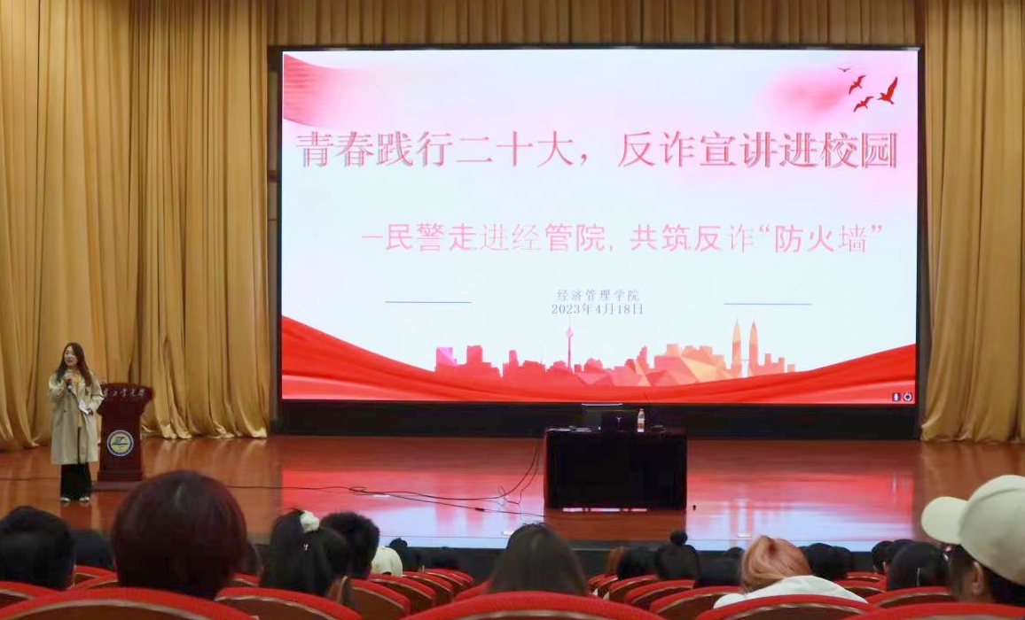 4月18日下午,经管学院在图书馆报告厅举办“青春践行二十大,反诈宣讲进校园——民警走进经管院,共筑反诈‘防火墙’”反诈教育专题讲座,邀请锦州市公安局网络安全保卫支队民警白洁警官作报告,学院党委副书记兼副院长宗宇、辅导员和2021级全体学生参加讲座。