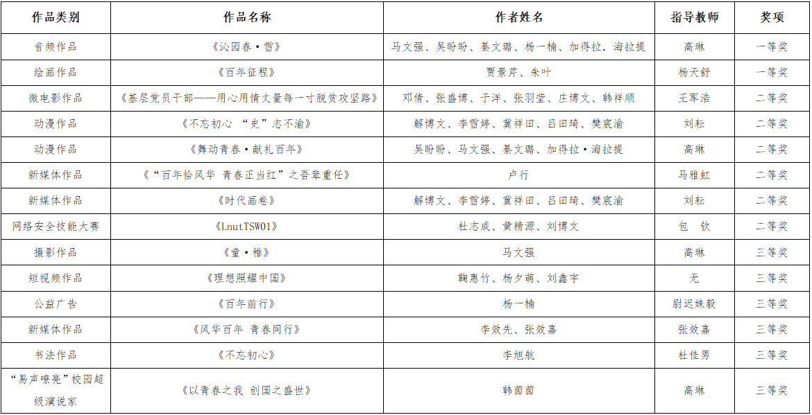 本次活动以“风华百年 青春同行”为主题,包括网文、短视频、微电影、公益广告、校园歌曲、演讲、新媒体作品等13项面向大学生网络文化作品征集项目,以及面向教师的工作案例、微作品、微课、网络文章等4项高校网络教育优秀作品推选展示项目。我校积极组织师生申报,经过层层选拔,共有21项作品在新媒体、绘画、音频、微电影比赛等多个项目中获奖。