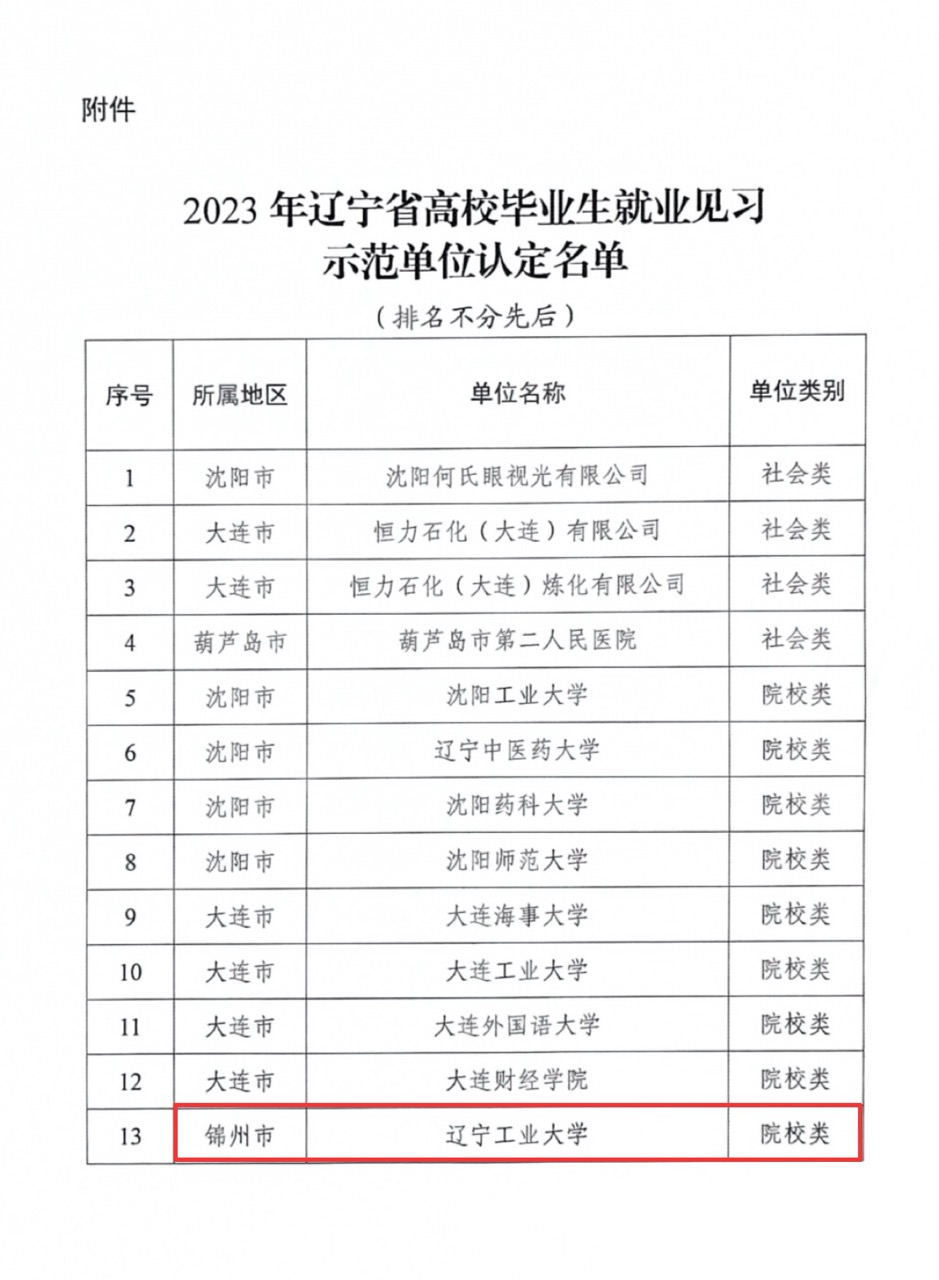 近日,辽宁省人力资源和社会保障厅公布“2023年辽宁省高校毕业生就业见习示范单位认定名单”,认定辽宁工业大学等9家院校类就业见习单位、沈阳何氏眼视光有限公司等4家社会类就业见习单位为“2023年辽宁省高校毕业生就业见习示范单位”,同时命名为“辽宁省青年就业见习示范基地”。