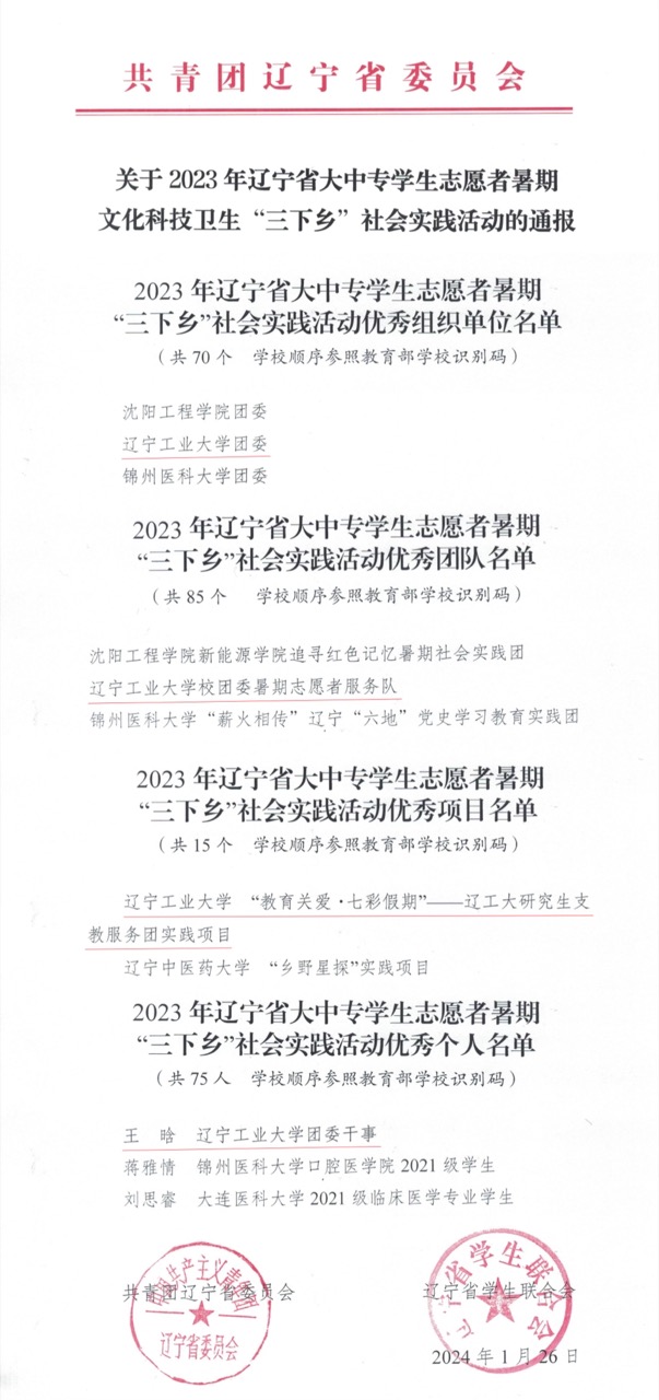 近日,共青团辽宁省委员会、辽宁省学生联合会通报了2023年辽宁省大中专学生志愿者暑期文化科技卫生“三下乡”社会实践活动的结果,辽宁工业大学团委荣获优秀组织单位、辽工大暑期志愿者服务队荣获优秀团队、《“教育关爱·七彩假期”——辽工大研究生支教服务团实践项目》荣获优秀项目、王晗荣获优秀个人。同时,在通报的2024年寒假“返家乡”社会实践工作中,我校学生报名和参与人数均居全省高校首位。
