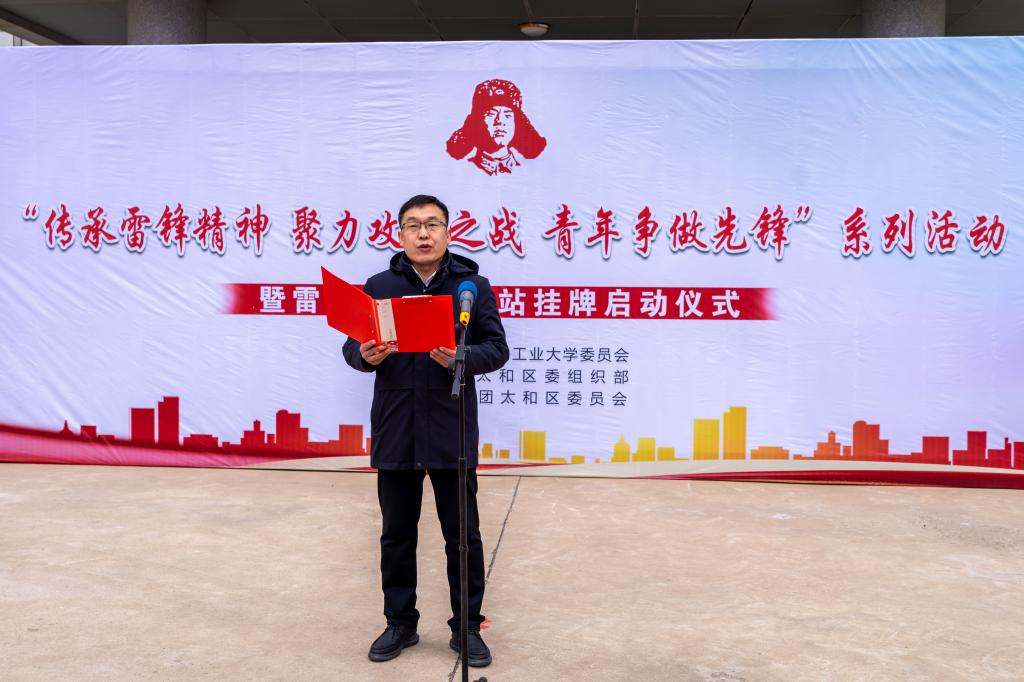 徐海滨代表太和区委、区政府致辞。他希望以辽宁工业大学与太和区共建的全市首家“学雷锋志愿服务站”为契机,吸引更多的辽工大学子进站开展志愿服务,发挥雷锋精神兴区育人作用,实现以青年为引领激发全社会的爱心和社会责任感,共同为太和、锦州的发展贡献青春力量!
