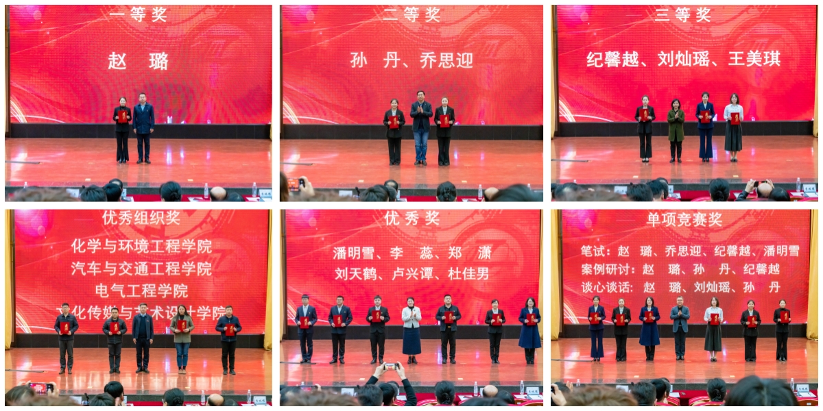 经过初赛笔试角逐,共有7个学院的12位选手进入决赛。决赛分为案例研讨和谈心谈话两个环节。在决赛中,参赛辅导员就大学生日常学习和生活中存在的普遍问题,探讨问题核心、共同辨析原因、精确提供解决思路、牢抓细节总结经验,从理论教育、制度解读、价值引领等方面进行鞭辟入里的分析,充分展现了辅导员队伍优良的专业素养和担当实干的精神品质。最终,化学与环境工程学院赵璐获得一等奖,汽车与交通工程学院孙丹、电气工程学院乔思迎获得二等奖,机械工程与自动化学院纪馨越、文化传媒与艺术设计学院刘灿瑶、王美琪获得三等奖。化学与环境工程学院、文化传媒与艺术设计学院、电气工程学院、汽车与交通工程学院获得最佳组织单位。决赛还评选出优秀奖6名,单项竞赛奖9名。