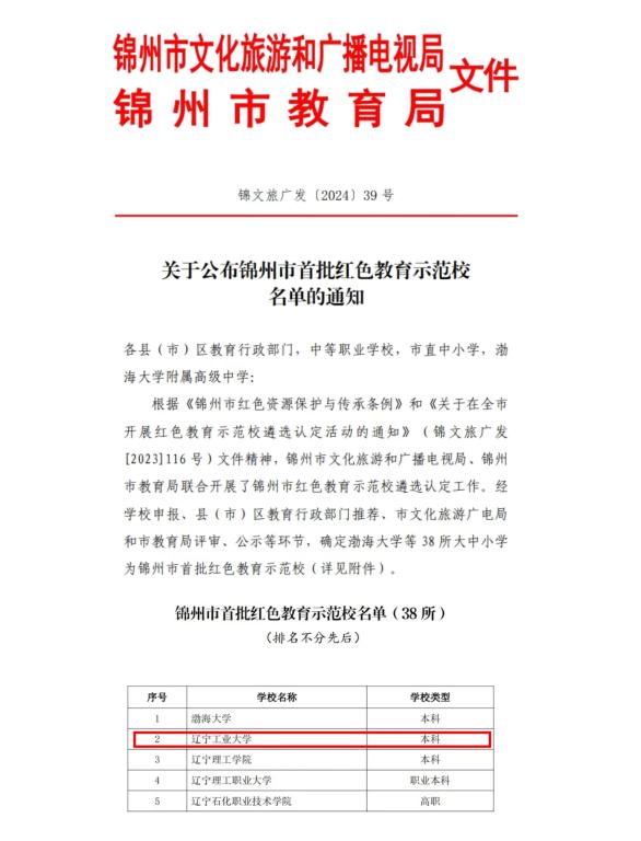 近日,锦州市文化旅游广电局、锦州市教育局印发《关于公布锦州市首批红色教育示范校名单的通知》,经推荐申报、专家评审等程序,我校获批锦州市首批红色教育示范校。