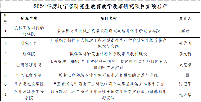 近日,辽宁省教育厅下发了《关于确定2024年度辽宁省研究生教育教学改革研究项目立项的通知》,我校获批7项研究生教育教学改革研究项目。